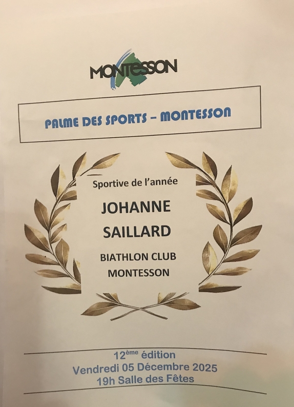 Cette 12ème édition 2025 s'est déroulée lors de la soirée conviviale du 5 décembre dans la salle des Fêtes communale où Johanne SAILLARD a été récompensée comme sportive de l'année en raison de ses résultats mentionnés ICI, en présence de Madame le Maire, de ses conseillers et du monde associatif montessonnais au grand complet. Johanne était accompagnée de sa maman, de Corine, Pascal, Gregory et Jean-Claude.